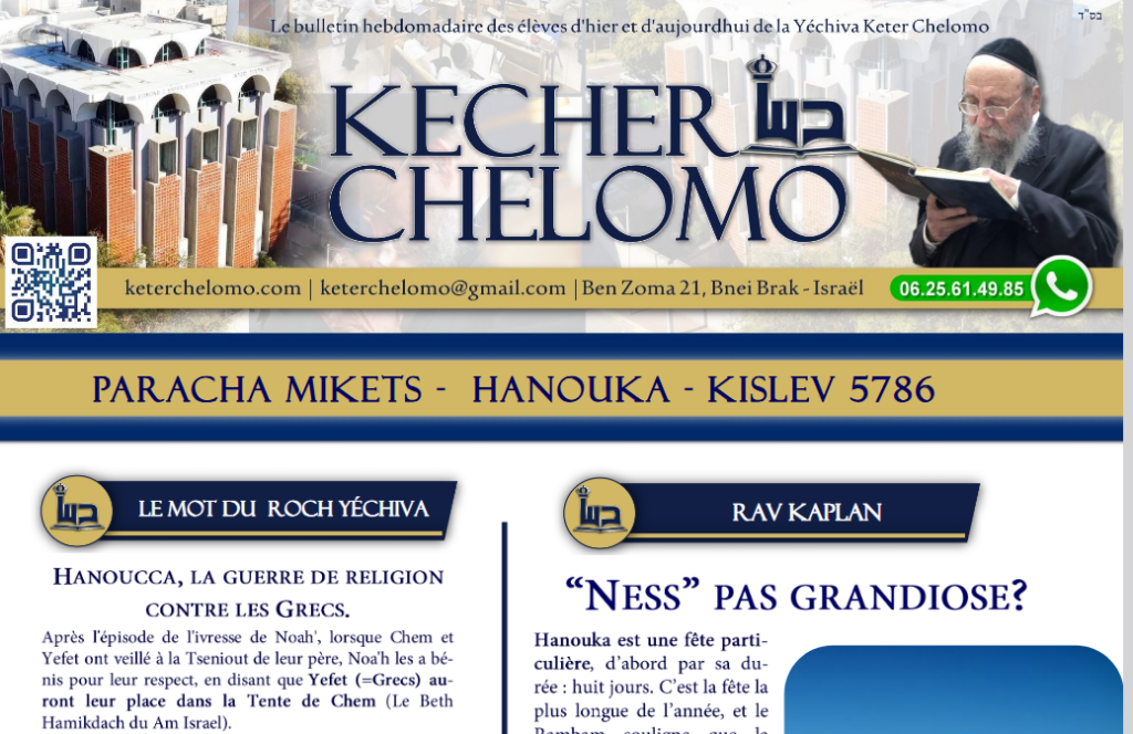 Nous sommes heureux de vous présenter le nouveau feuillet de la Yechiva Keter Chelomo.Bonne lecture, et n’hésitez pas à le partager autour de vous. Merci ! Post navigation Précédent Aidons cette famille pour Hanouka ! Laisser un commentaire Annuler la réponseVous devez vous connecter pour publier un commentaire. Plus d'histoires A la une Evenements Hanouka Aidons cette famille pour Hanouka ! 14 décembre 2025 OVDHM La paracha de la semaine Rav Mordekhai Bismuth Vidéo Mikets: Tu as changé avec ta barbe! 14 décembre 2025 OVDHM A la lumiere du Zohar La paracha de la semaine Rav Mordekhai Bismuth Vidéo MIKETS Zohar: Qui mérite des miracles? 14 décembre 2025 OVDHM
