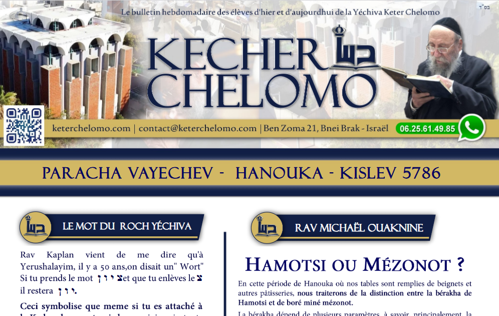 Nous sommes heureux de vous présenter le nouveau feuillet de la Yechiva Keter Chelomo.Bonne lecture, et n’hésitez pas à le partager autour de vous. Merci ! Post navigation Précédent A quoi sert le miracle de la fiole d’huite?Suivant Vayechev: La cellule de la délivrance Laisser un commentaire Annuler la réponseVous devez vous connecter pour publier un commentaire. Plus d'histoires Les Livres Wort sur la Paracha…TOLDOT 16 novembre 2025 OVDHM Les Livres 💔 Trouma – Une famille dans la tourmente – votre aide peut tout changer ! 6 novembre 2025 PC Ebook Les Livres Echet ‘Hayil – Le livre 30 octobre 2025 OVDHM