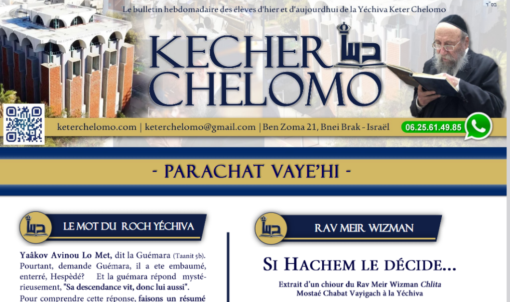 Nous sommes heureux de vous présenter le nouveau feuillet de la Yechiva Keter Chelomo.Bonne lecture, et n’hésitez pas à le partager autour de vous. Merci ! Post navigation Précédent Étude de Michna dédiée – Un mérite éternel Laisser un commentaire Annuler la réponseVous devez vous connecter pour publier un commentaire. Plus d'histoires A la une Evenements Étude de Michna dédiée – Un mérite éternel 30 décembre 2025 OVDHM 10 tevet A la une De Charlie Chaplin à Tik Tok…. (Jeune du 10 Tevet) 29 décembre 2025 OVDHM La paracha de la semaine Rav Mordekhai Bismuth Vidéo Vayehi: La bénédiction de l’exil 28 décembre 2025 OVDHM