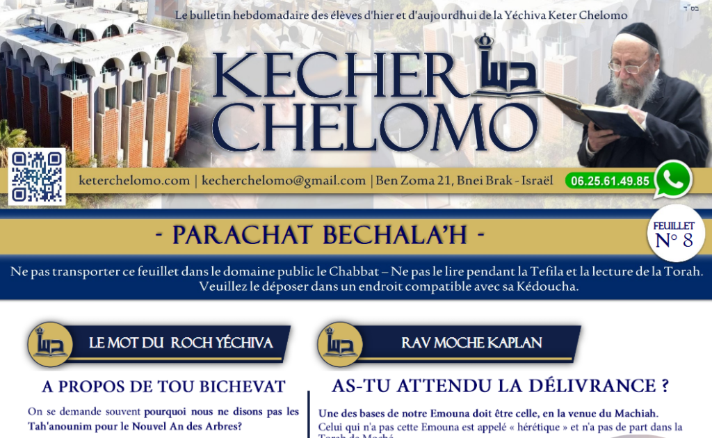 Nous sommes heureux de vous présenter le nouveau feuillet de la Yechiva Keter Chelomo.Bonne lecture, et n’hésitez pas à le partager autour de vous. Merci ! Post navigation Previous Ebook Tou bichevatNext ZOHAR Bechalah: Arrête de prier! Laisser un commentaire Annuler la réponseVous devez vous connecter pour publier un commentaire. More Stories La paracha de la semaine Pessa'h Rav Mordekhai Bismuth Bechalah: Des blancs qui en disent long 28 janvier 2026 OVDHM La paracha de la semaine Rav Mordekhai Bismuth Vidéo Bechala’h: Le Mérite des femmes 28 janvier 2026 OVDHM A la une Les fetes Les Livres Tou Bichevat Ebook Tou bichevat 24 janvier 2026 OVDHM